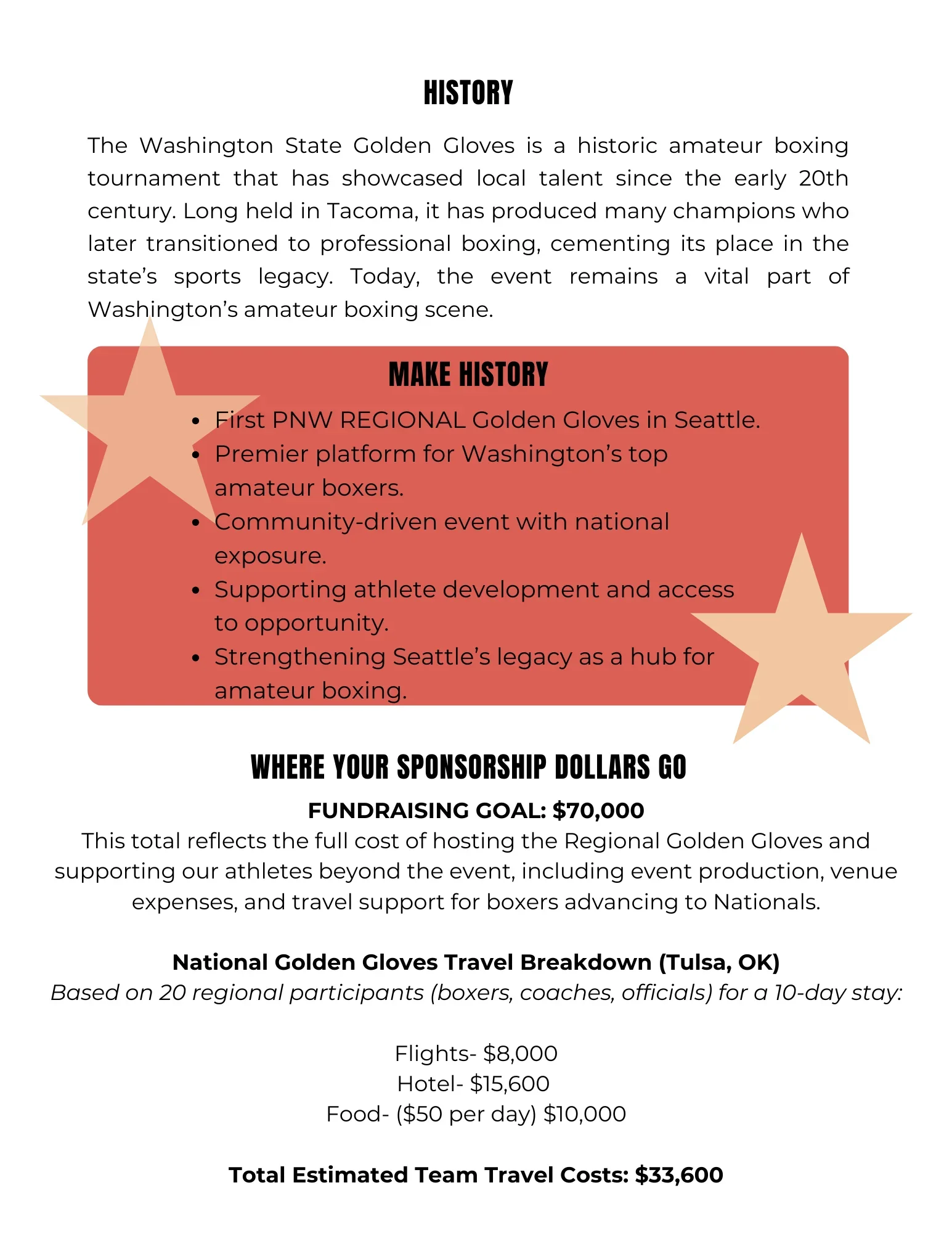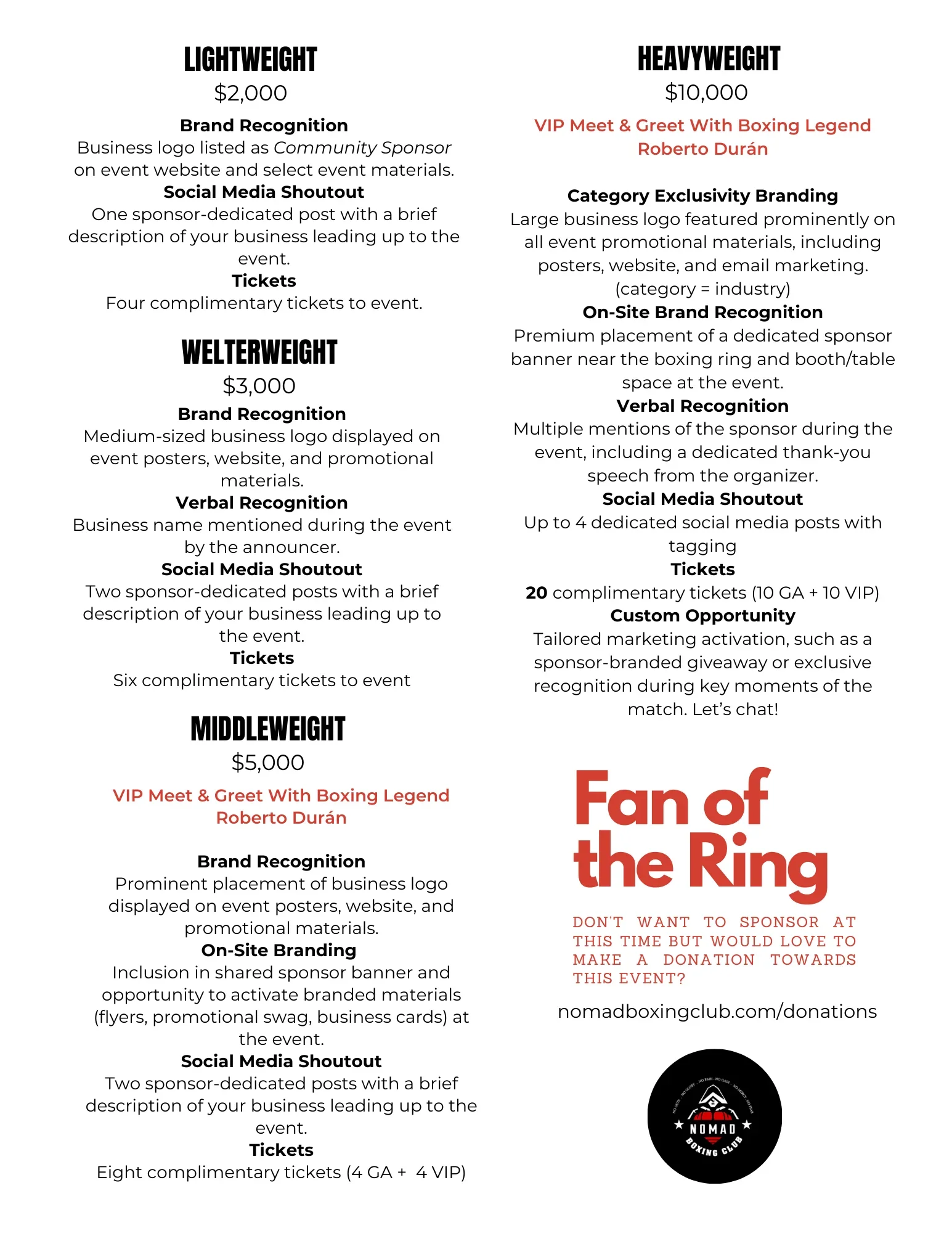 A $500 “easy yes” option is available for businesses and individuals who want to support the fighters and be visibly associated with this historic event.